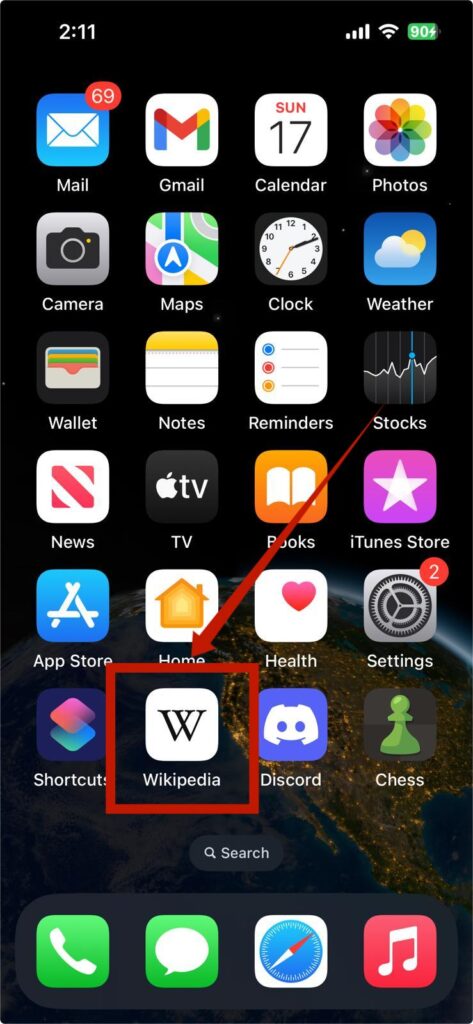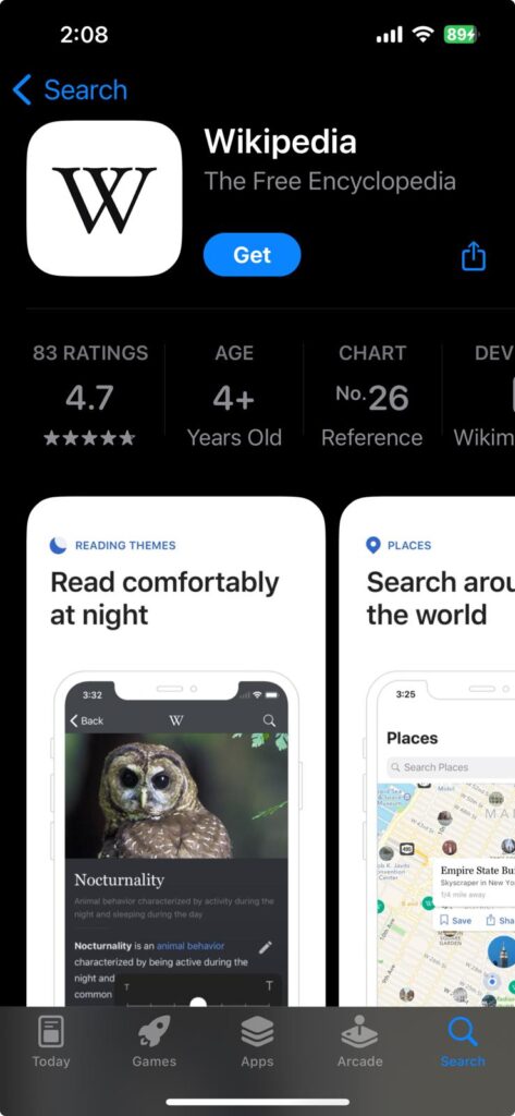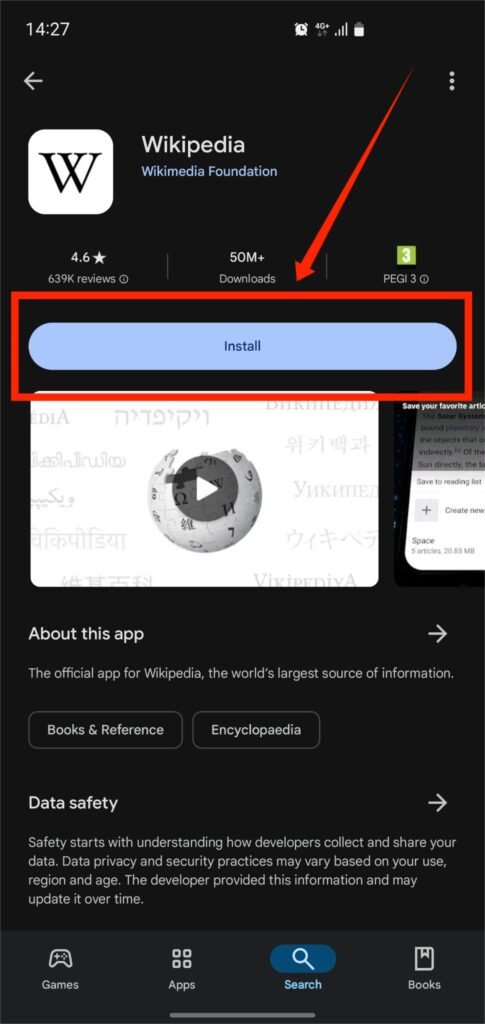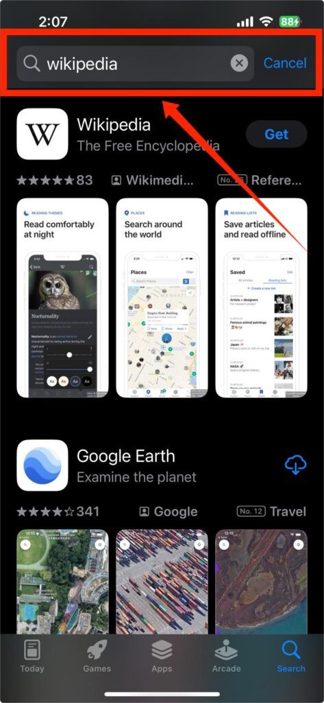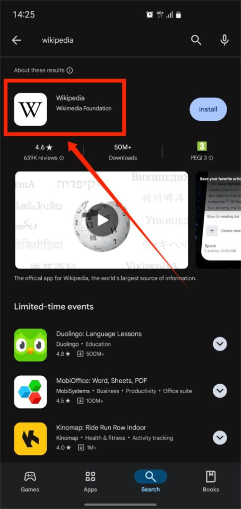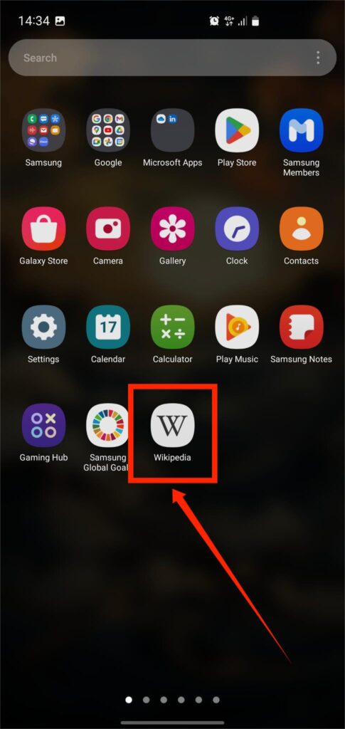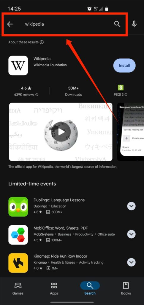 - Va apărea o bară de căutare în partea de sus a ecranului. Introdu numele aplicației dorite, de exemplu, Wikipedia”, și apasă pe Enter.