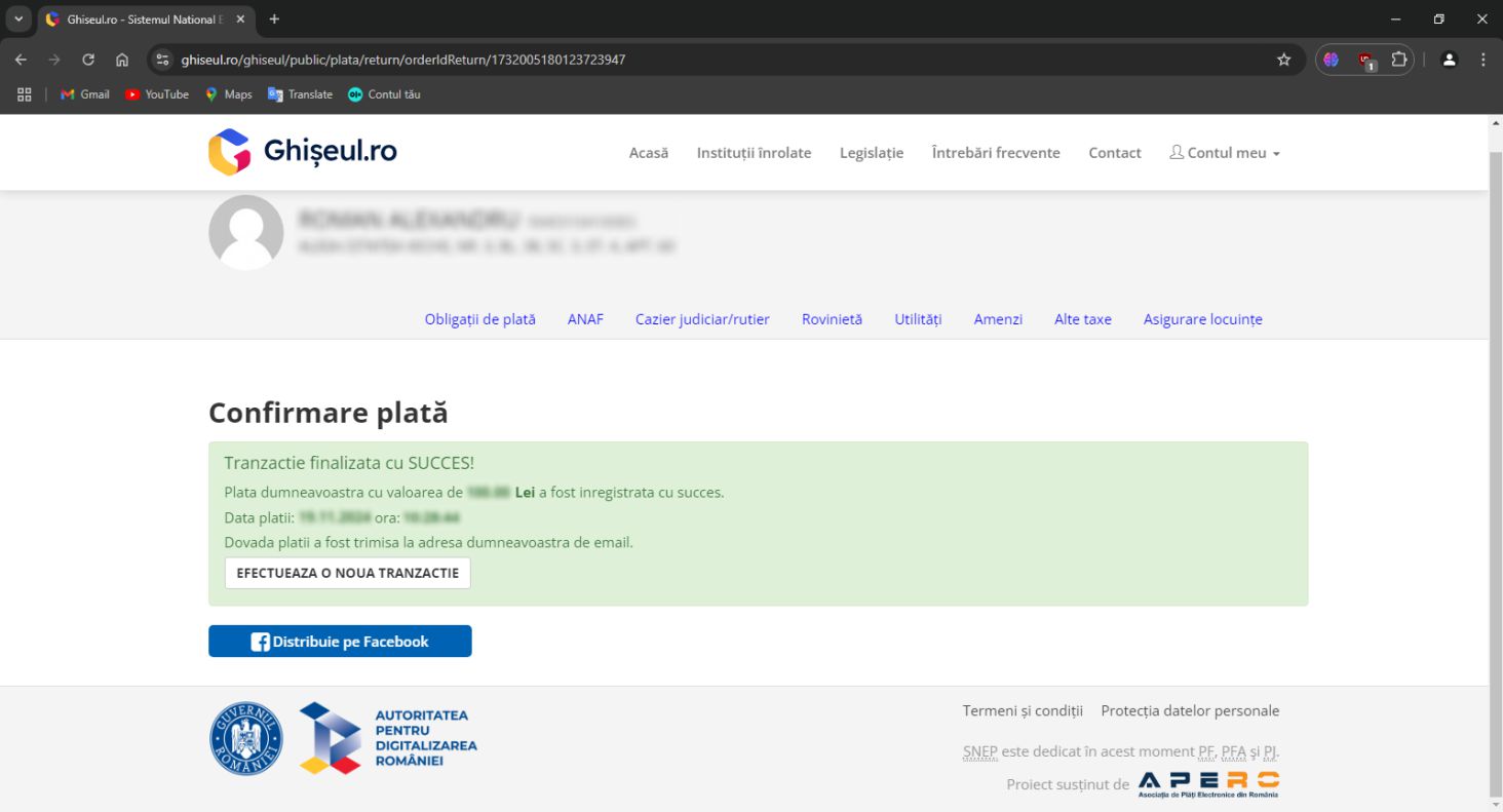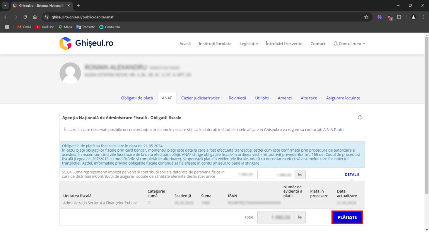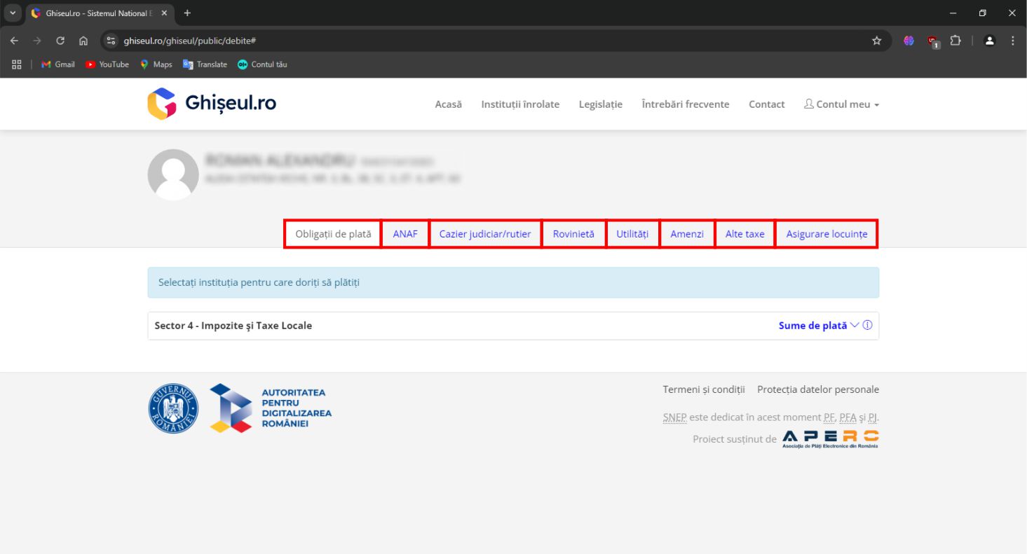 Pe platforma ghiseul.ro pot fi plătite Impozite şi taxe stabilite de instituţiile publice înrolate în sistem precum si amenzi contravenţionale cu deducerile aferente plăţii în 15 zile calendaristice.